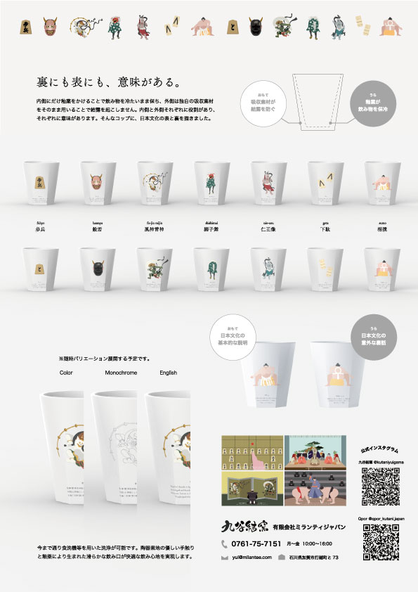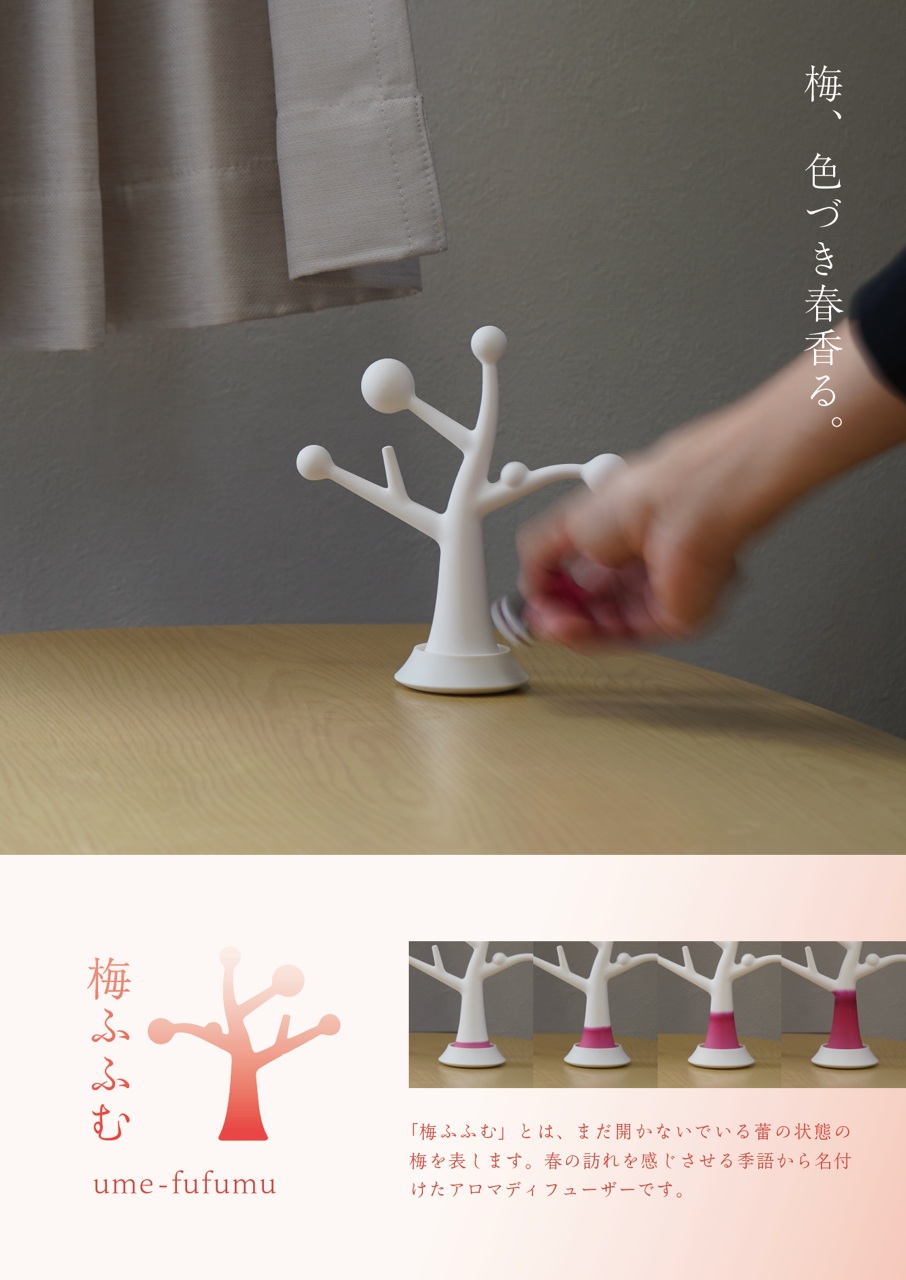魅力梅がほころぶような喜びを込めて。アロマオイルを吸い上げ、真っ白な生地が鮮やかに染まりゆく「視覚体験」を提案します。 こだわり九谷の技法と現代的な造形美が共存する、機能性とデザイン性を兼ね備えた新しいカップの形を追求しました。